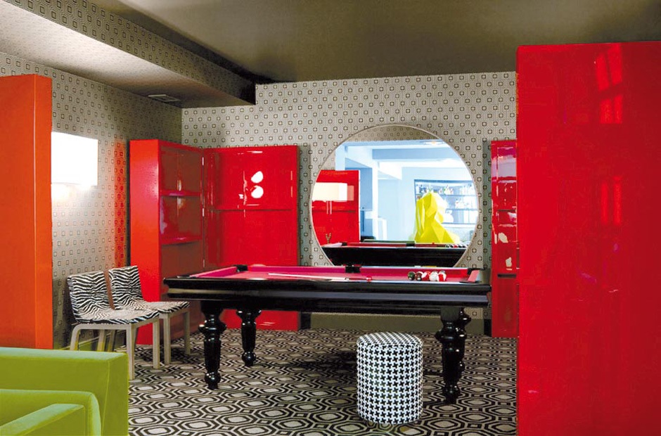Le style rustique s’associe également parfaitement à d’autres inspirations déco comme le style industriel ou le style vintage. Alors pourquoi ne pas tenter le décalage total comme l’a fait India Mahdavi pour aménager l’espace billard du bar Le Germain à Paris : le style rustique revisité s’y intègre avec des coloris pop et graphiques pour apporter une âme unique au lieu.